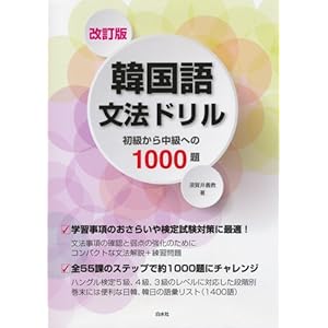 韓国語文法ドリル 改訂版 コリアブックセンター ~ 商品詳細 初級から中級への1000題 著:須賀井義教 白水社 20184 175P B5判 2160円 文法の解説+練習問題の全55課、問題は約1000題。ハン検5〜3級の文法事項のおさらい、弱点強化に最適。文法問題を強化した